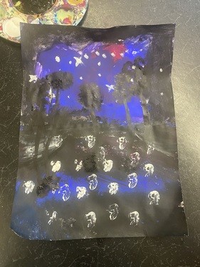 This painting was about shadows and light and created by Gabriel Rosario, 13 years old. His the son of Pastor Charity and is on the autism spectrum with emerging language, yet his art speaks. Perhaps grief is similar to lurking in the shadows.