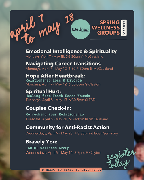 This Spring's Wellness Groups are a diverse and timely mix of support and learning. I'm asking you to review the list of groups and then invite your family and friends. Maybe share the flyer below on social media.