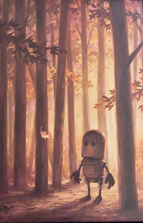 One of my favorite pieces by Matt is entitled “Threshold.” It depicts a beautiful forest landscape where the very first leaf is falling for the upcoming season. Per usual, Dixon’s art contains a simple robot observing or participating in the natural world.