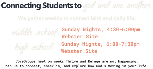 GREAT question. It can get a little confusing. One Sunday a month, all of our middle schoolers gather together for Thrive. Later those nights, high school meets for Refuge. CoreGroups are just small groups that meet every Sunday night that those aren't happening. See the calendar to know what's happening each week.